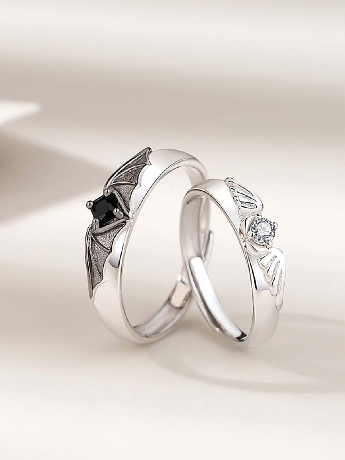 Design: uma aliança com asa de anjo e outra com asa de morcego